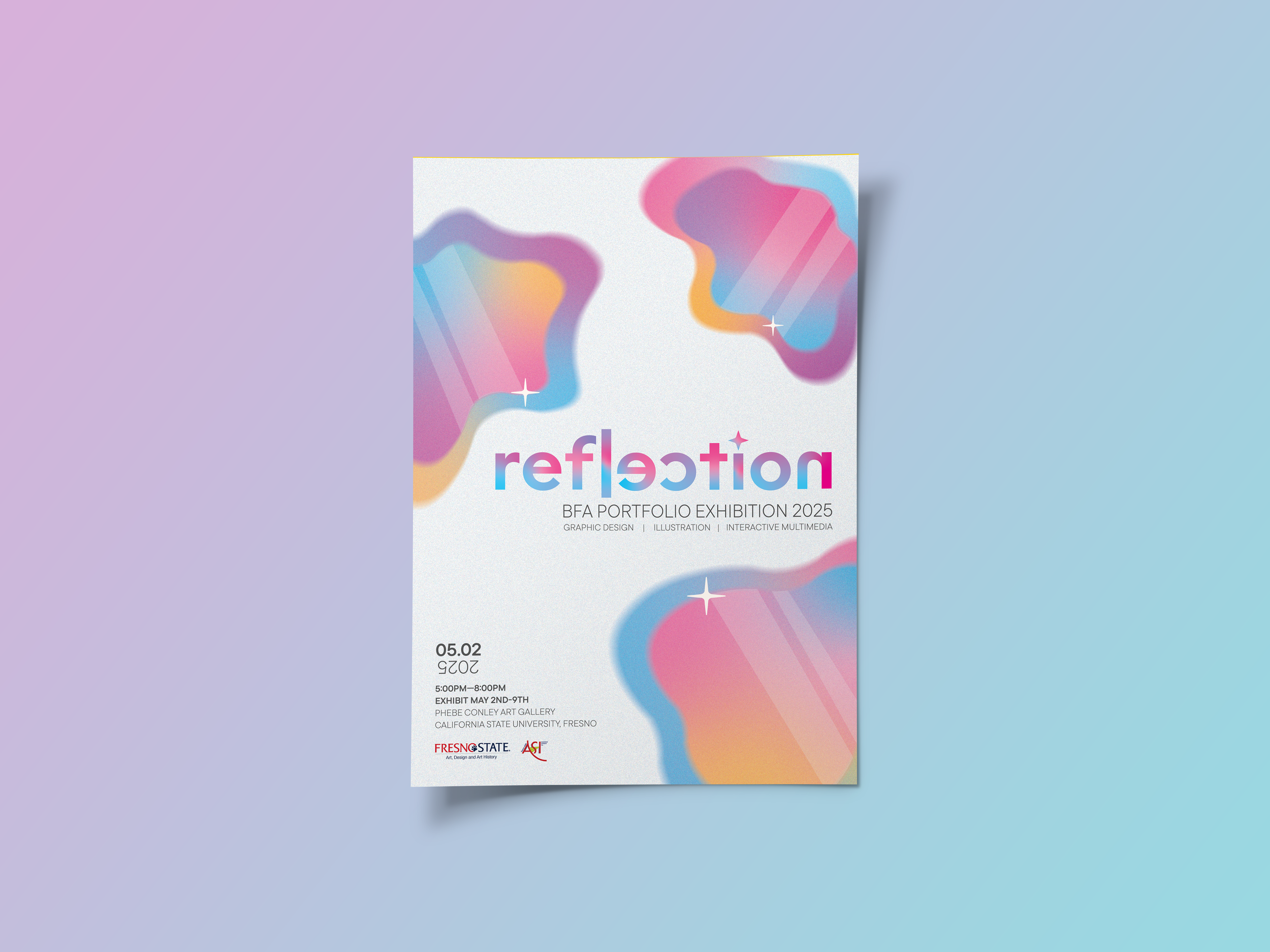 Create a poster and brand for the Graphic Design BFA Senior Exhibition. As part of the branding committee, we developed multiple posters and voted on which to move forward. My poster was nominated and won the class vote to represent the BFA Portfolio Exhibition of 2025.